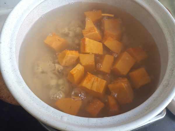 第五步:加入南瓜塊,南瓜比較好熟後放入就可以。