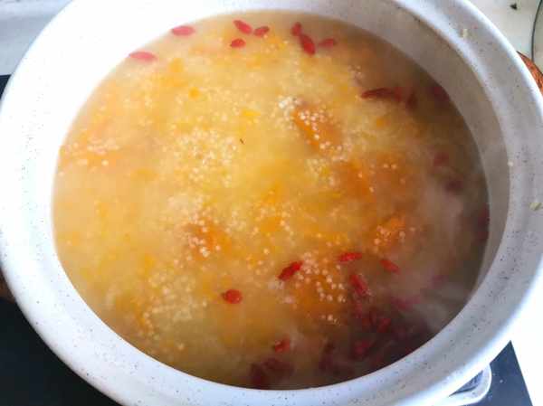 第六步:然後加入洗淨的小米,繼續小火熬煮大約15分鐘。