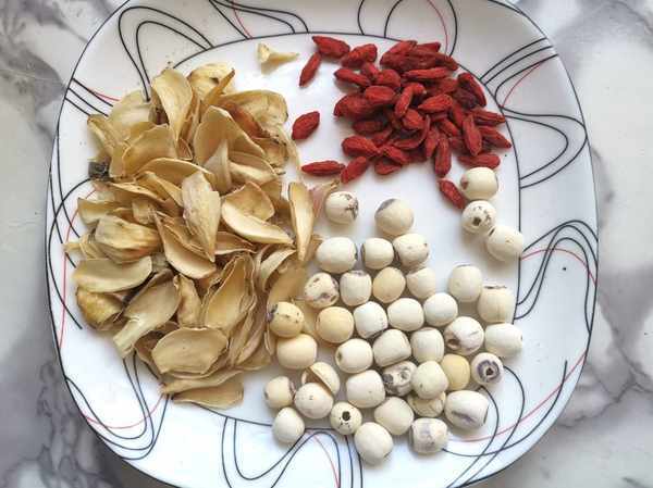 第一步:百合,蓮子,枸杞準備好,洗淨。蓮子和百合有安神助眠、潤肺止咳、清熱降火、潤腸通便等作用,很適合秋天多吃。百合蓮子有清熱降火的作用,尤其適宜容易上火的人群吃。特別是對於心火旺盛的人來說,吃蓮子能够有效降心火、清心安神。