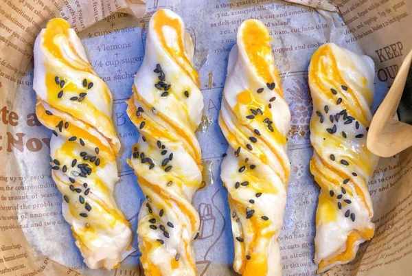 1:手抓饼解冻,放上一根香蕉,卷起来切小段,表面刷上蛋黄液,撒点黑芝麻,空气炸锅180℃ 烤10分钟
