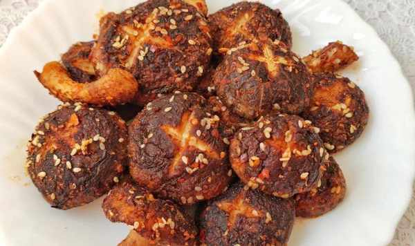 食材:香菇,孜然粉,五香粉,辣椒粉,盐,橄榄油,芝麻