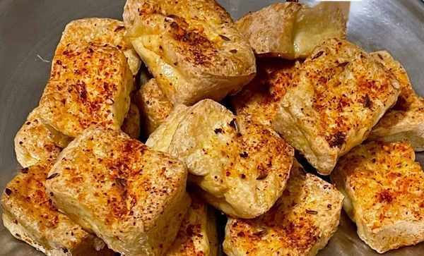 1:老豆腐提前泡水5分钟,空气炸锅底部刷一点油防止粘锅,放入空气炸锅180度烤15分钟,翻面再180度烤8分钟,撒一点烧烤粉再200度烤4分钟