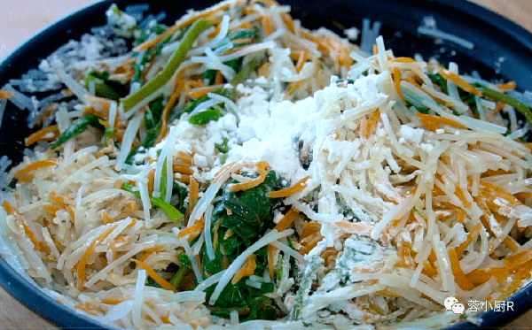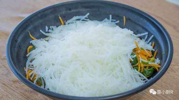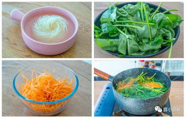 1、先来泡粉丝,温水就行;空心菜一把,先清洗干净,把叶子都掰下来,比较粗的梗儿就不要了;胡萝卜1根,擦成细丝;起锅烧水,水开后加一勺盐,几滴食用油,把空心菜倒进来焯水一分钟,胡萝卜丝也加进来;
