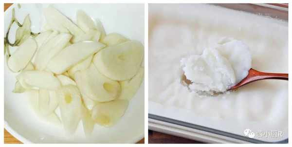 2、大蒜切片,另准备两大勺猪油备用,用猪油炒出来的青菜更香;