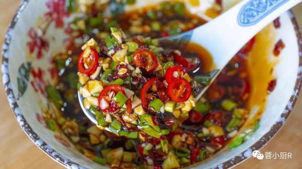 2、蒸豆腐的时间来切点配菜,小葱一把切成葱花,大蒜半头切成蒜末,小米辣3个切成小圈圈,先把切好的蒜末、葱花、小米辣都装入碗中。接着加生抽、米醋、盐、糖、香油、辣椒油。搅拌均匀后就可以了。