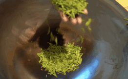 鲜叶入锅的瞬间,一旗一枪在220℃的高温下噼里啪啦,紧接着炒茶师傅用抓、抖、搭、拓、捺、推、扣、甩、磨、压十大手法,交替进行。