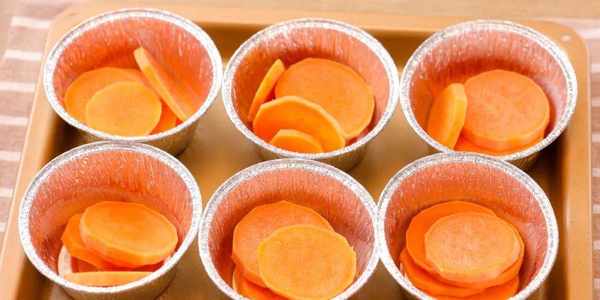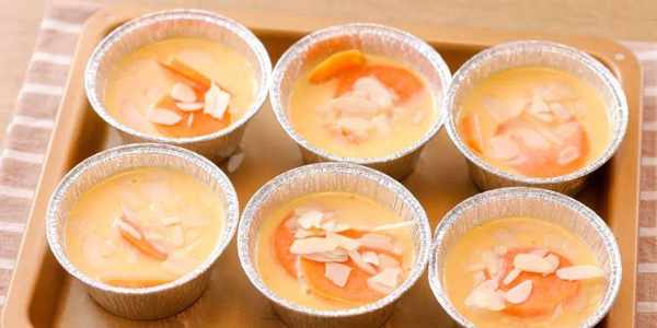3.模具刷上薄油,放入红薯片,倒入蛋奶液,面撒上杏仁片。