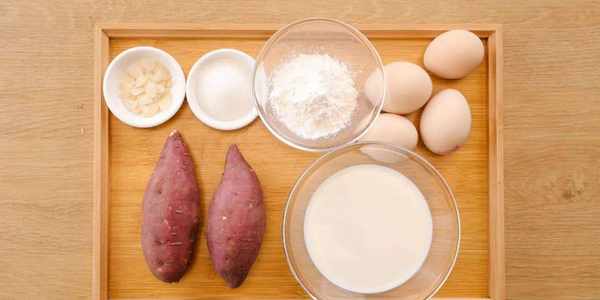 红薯/两个、鸡蛋/4个、牛奶/200g、细砂糖/20g、玉米淀粉/40g、杏仁片/适量