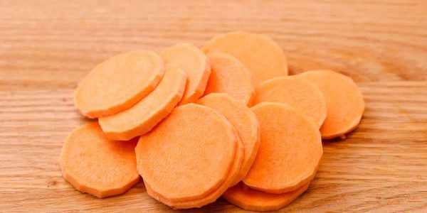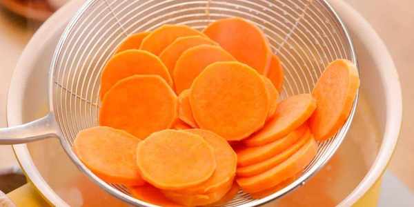 1.红薯去皮切成约3mm的厚片,放入开水中,焯水1分钟后,捞出沥干水份待用。