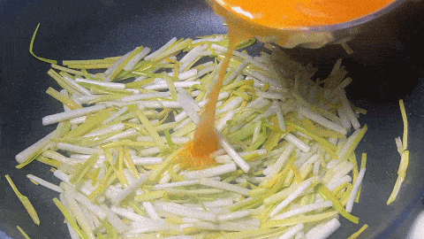 6. 炒软炒香,炒出汁水,然后倒入鸡蛋液