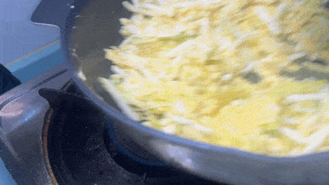 8. 用铲子炒成块状,加入食盐调味