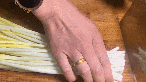 1. 择洗干净的韭黄,放在案板上切成长段,大概5厘米左右