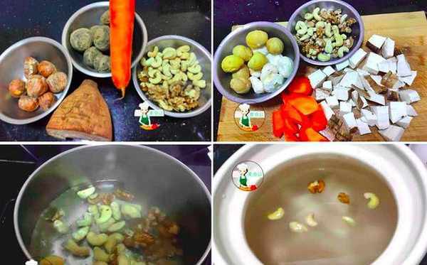 3、把坚果类食材核桃、腰果先焯水一下再煲汤,可以减少坚果出油的味道,汤会更好喝。
