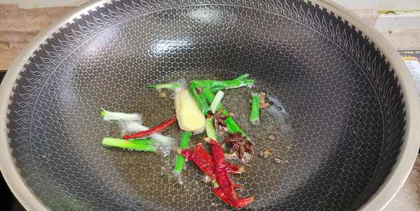 第四步:锅里烧多一点的油,先把八角,花椒,葱姜下锅爆出香味,接着将沥干水分的鸡爪下锅开始翻炒,翻炒至鸡爪面微黄的程度开始下一步。