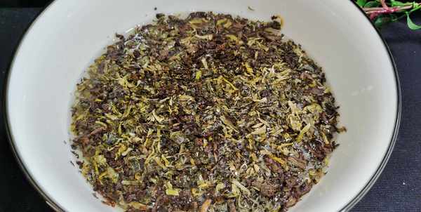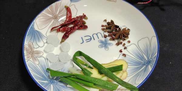 第三步:准备梅干菜一把用凉水浸泡1个小时时间,而后清洗掉盐分挤干水分备用,梅干菜中会有泥沙尘土,一定要清洗干净。在准备一点香料,八角2个,干花椒几十个,干辣椒一把,葱姜适量,青红椒切圈备用。