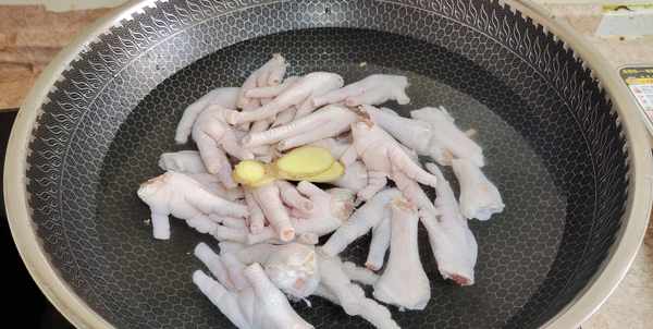 第二步:将鸡爪多多的清洗几遍,而后凉水下入锅中,加入姜片和料酒,开大火开始焯水,过程中将水面析出的血末全部打捞干净,水开后煮3分钟就捞出来,再用温水冲洗干净放一边沥干水分备用。