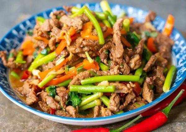 5.下入西红柿和一勺蚝油,多煸炒一会,把西红柿炒出汁水。下入白玉菇、木耳和炒好的鸡蛋,翻炒一分钟左右,让所有食材吸收锅内的汤汁。最后加入2克食盐调味、1克白糖提鲜,再下入小葱段翻炒一下,把调料炒匀,炒出葱香味后即可出锅。第三道:蒜苔炒牛肉牛肉,享有"肉中骄子"的美称。是我们国家的第二大消耗量的肉类食品,仅次于猪肉。而且比起猪肉,牛肉的蛋白质含量更高,而脂肪含量更低,营养价值更高,对人体健康更有益。