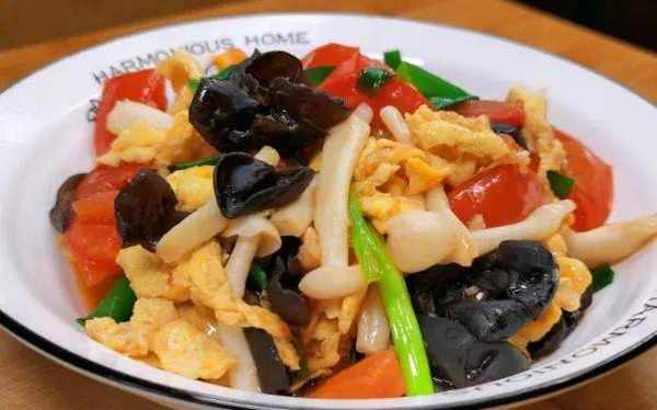 6.海带好熟,筒骨炖烂了,就可以放入海带了,煮开后转小火,继续再煲10分钟就可以了。10分钟后,根据家人的口味,放入适量的食盐调味;煲汤的盐建议起锅前再放,这样煲出来的汤水味道才会鲜美。最后再放些虾米、枸杞和葱花,煮上一分钟,增鲜增色即可关火;第二道:白玉菇炒鸡蛋白玉菇,又叫白雪菇,菇体洁白如玉,晶莹剔透,有“金枝玉叶”的美称。白玉菇的蛋白质含量比一般蔬菜要高许多,同时含有多种人体必需的多种微量元素。含有的粗纤维可促进肠道蠕动,具有预防便秘、肠癌、提高新陈代谢等功效。用白玉菇跟鸡蛋,木耳还有西红柿一起炒,味道鲜美,营养高。