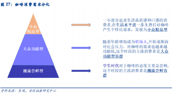 整个咖啡市场呈现出金字塔式需求分化,分为小众精品型、大众功能型、潮流尝鲜型。