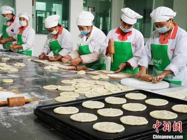 近日,记者走进新疆和田地区洛浦县恰尔巴格镇巴格艾日克村和田众观食饮品发展有限公司的馕生产车间内,员工正在制作当天的订单,浓郁的馕香味满室皆闻。