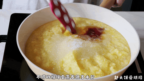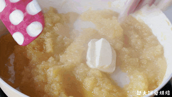 加入黄油,转中小火,不停翻炒,直到能抱团(做好的凤梨馅,密封冷冻可保存1个月)