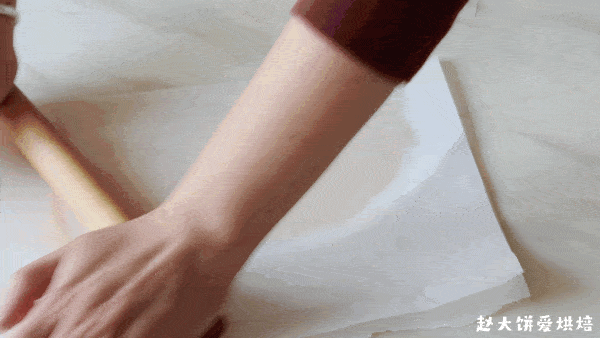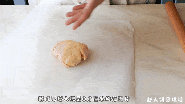 5,取一份面团放在油纸之间,擀开成厚度约0.3厘米的薄面片