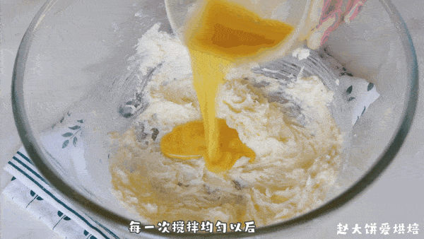 分两次加入室温的全蛋液,每次搅打均匀以后,再加入下一次