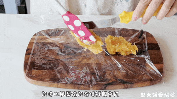 2,放凉的凤梨馅,取一半放在保鲜膜中,铺成长条