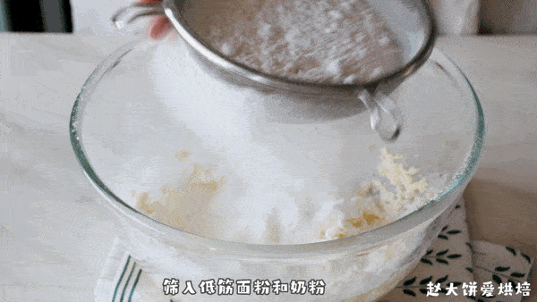 4,筛入低筋面粉和奶粉,用刮刀切拌至看不见干粉