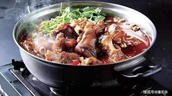 3、接着把烧好的羊蹄入铁锅,加热后舀在小火锅盆内。