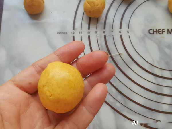 第三步:把南瓜泥中加入糯米粉和成麵團,分割成小劑子,按扁,包入豆沙餡收口,團成圓球。
