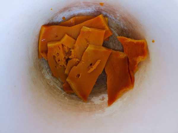 第二步:去皮切片的南瓜放入微波爐中,高火叮5分鐘,熟透拿出壓成南瓜泥。