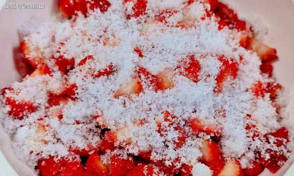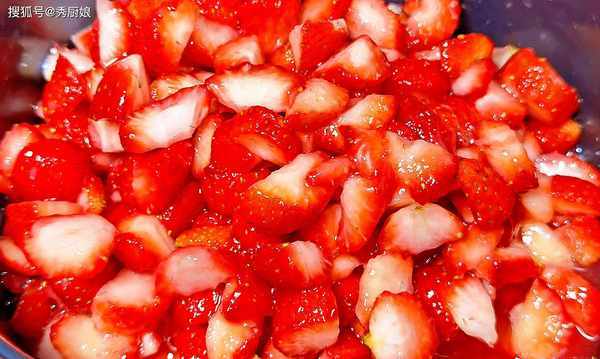 2.将草莓切成小块,装入盆中,加入白糖,搅拌均匀,密封起来,静置1个小时,将草莓内的水分,腌制出来。