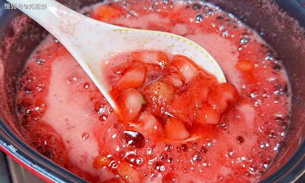 3.把草莓和汤汁全都倒入锅中,开中大火煮,边煮边用铲子不停地搅拌,使草莓受热均匀,草莓变软后,滴入柠檬汁,调成小中火,熬至果酱浓稠后关火,自然放凉后,将果酱装入无水无油的容器里,密封放入冰箱保鲜层保存。早餐时,涂抹在鸡蛋饼或面包片上,酸甜可口,特别好吃!