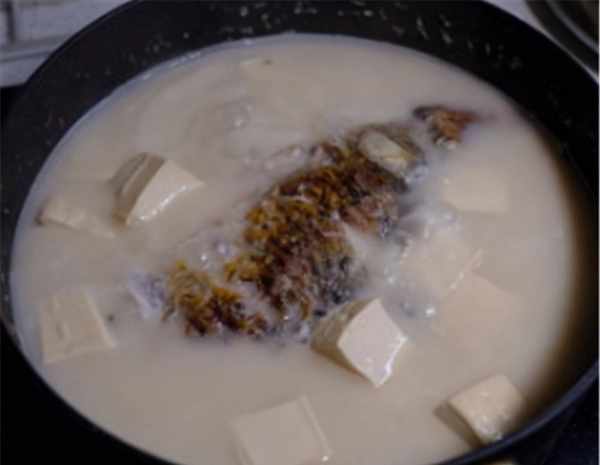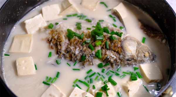 第四步:这个时候就可以下豆腐块了,加入豆腐后继续用中小火煮10分钟左右,在出锅前3分钟左右的时候可以往锅中加入适量的盐加以调味。这种鱼熬出来的汤汁本身味道就已经很鲜美了,所以除了盐也不需要加别的什么调料了。将之前放入锅中的葱结捞出来,然后在上面撒上一些葱花,增加其卖相,就可以开吃了。