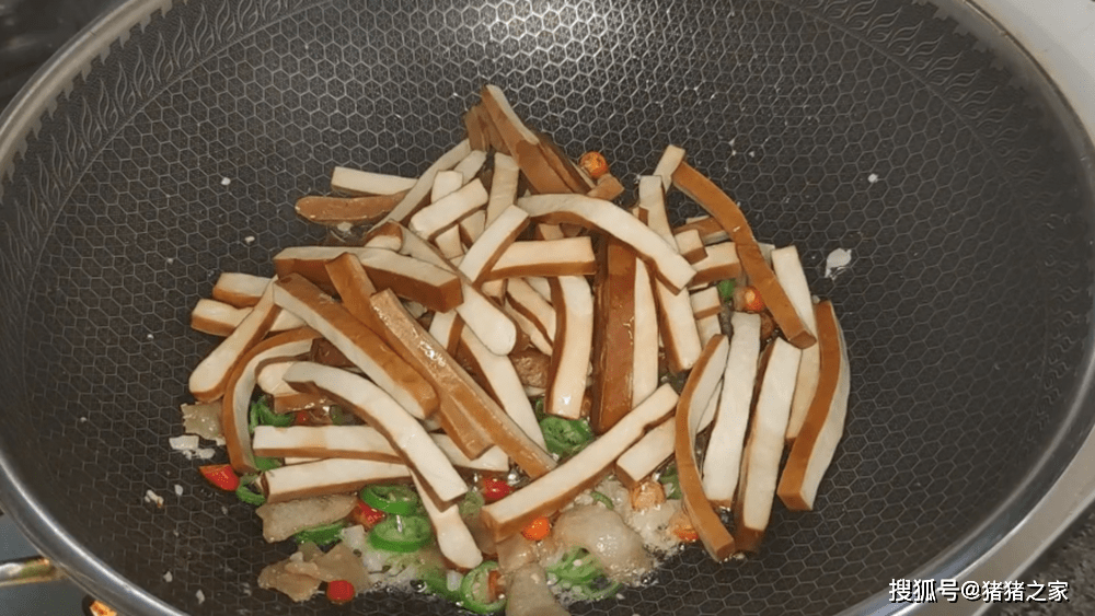 4.重新起锅,加少许油,油热后下入肥肉片煸炒出多余的油脂,接着倒入蒜末炒香,再倒入青红小米椒炒出咸辣味,然后加入焯好水的香干,翻炒几下。加入生抽、老抽、蚝油、白糖、盐,翻炒均匀。
