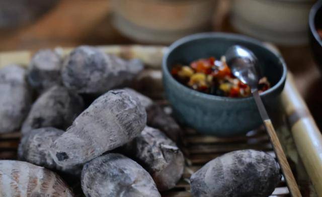 将芋头切成厚薄均匀的片,然后下入烤炉里,临出炉前撒点哑巴调味即可,这或许是古人吃得最原始的“薯片”吧