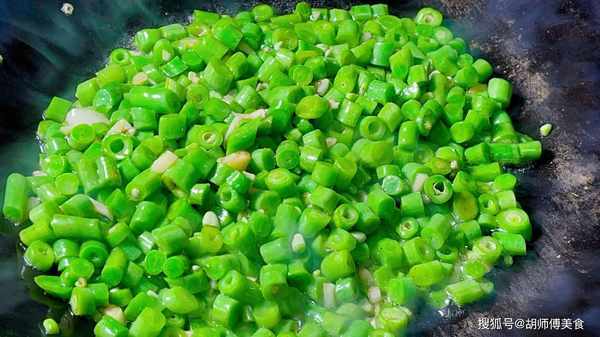 第三步:再把锅烧热,放适量油到锅中,等油温烧到5成热时,将蒜末和豆角末放入到锅中,大火爆炒七八下后,然后撒少许食盐、胡椒粉、生抽到锅中炒匀。