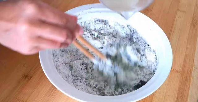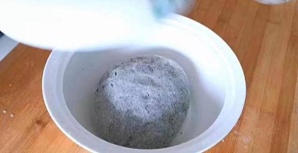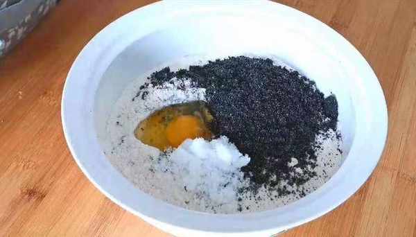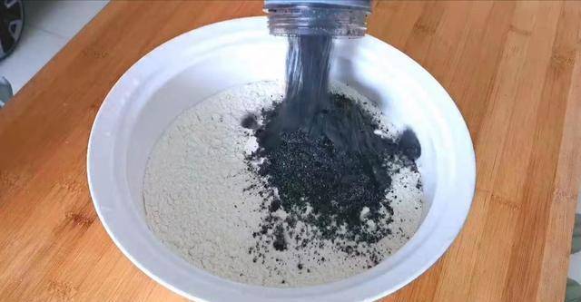 3、盆中加入适量的面粉,倒入黑芝麻粉。
