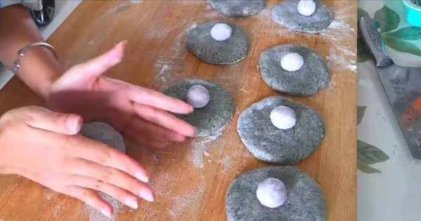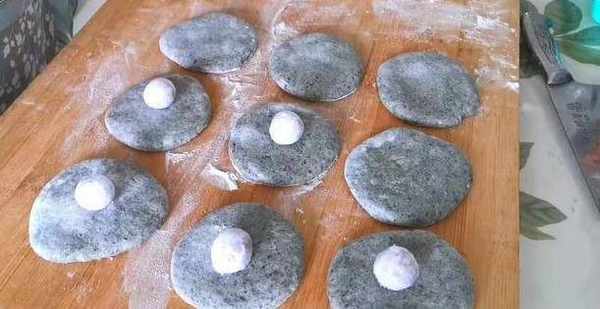 11、以此类推,所有的面剂擀成面饼状后,在上面放一个元宵,这样后面才会出现拉丝爆浆的效果,当然,如果你不喜欢也可以不放哦。