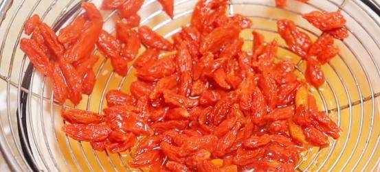 2、此时将枸杞洗净,在枸杞中加入少许淀粉或面粉,然后加入清水洗净,可以去除枸杞上的污垢,类似于用面粉洗葡萄,然后再次冲洗漏勺,沥干水分水以备后用。