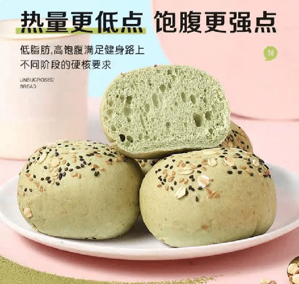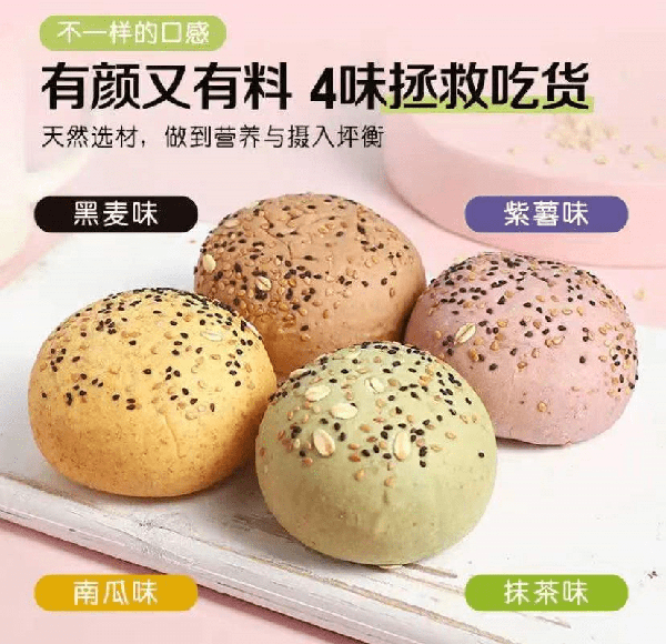 整体是用全麦面粉制作的,0蔗糖、低脂低卡,饱腹感也比较强,平时当做三餐的主食,或是加餐的零食都是不错,一个热量仅有84大卡,除了开袋即是外,大家还可以用它做汉堡,从中间一份为二,放上蔬菜、煎好的鸡身材肉,一份减脂汉堡就做好了,热量不到300大卡,轻松实现吃饱还能漂亮。