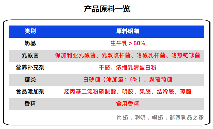 1、奶基:这款产品的奶基使用的是生牛乳,保证了产品的新鲜度;生牛乳含量>80%,说明添加其他配料较多,属于风味酸奶,且符合国标要求。