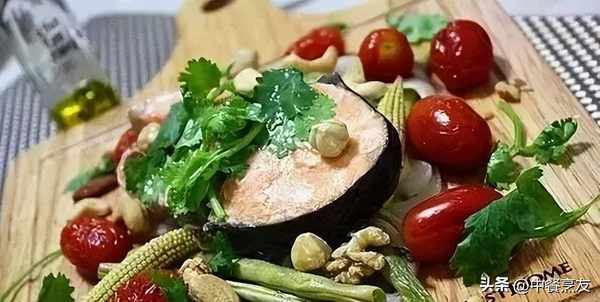 7、再铺上烤好的鲑鱼,撒上松仁即大功告成。