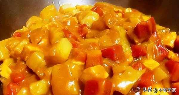 3、炒锅放油约两汤匙,放入咖喱粉、面粉、蒜泥,用小火炒出香味,加入大葱煸香,加入小半杯水将面和开,再加入一饭碗水,放入鸡粉搅匀,放入鸡块,烹入绍酒,用中火加热5分钟,再加入土豆,调好咸淡,煮至鸡肉熟烂汁浓时,淋香油出锅即可。