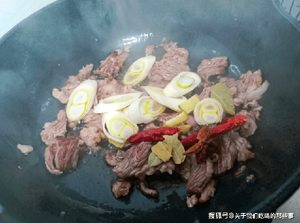 4、锅里重新倒入少量油,放入五花肉片小火煸炒,炒出多余的油脂,这样吃起来不油腻,而且味道更香。肉片颜色金黄过后放入葱片、姜丝、干辣椒、八角、花椒炒香,淋入一些老抽翻炒上色,倒入白菜帮子,大火翻炒2分钟。