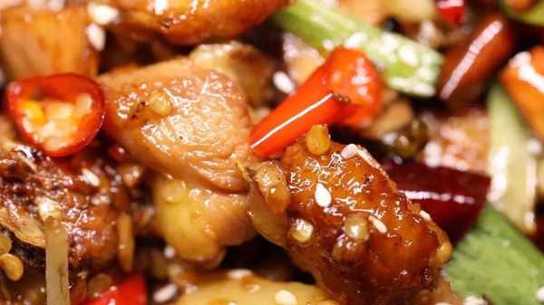 论对“鸡”的烹饪,不得不提到的就是“辣子鸡”。端上桌的辣子鸡干香厚重,鸡肉与辣椒入味融合,咬开过后是鲜美多汁,刺激着你的味蕾!