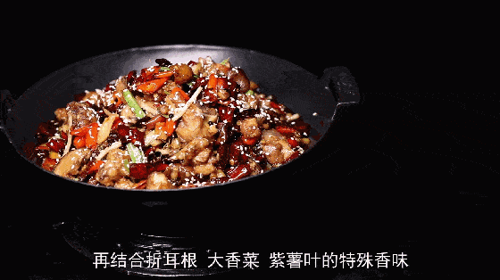 锅里留底油,加入干海椒、青花椒炒出香味后加入小米椒、姜、蒜,芳香扑鼻的时候就加入鸡块,倒入少许生抽然后加入香菇炒断生。然后再加入折耳根、大香菜、紫苏叶、清水进行翻炒,然后再加入水豆粉炒匀,起锅前加入少许藤椒油即可。