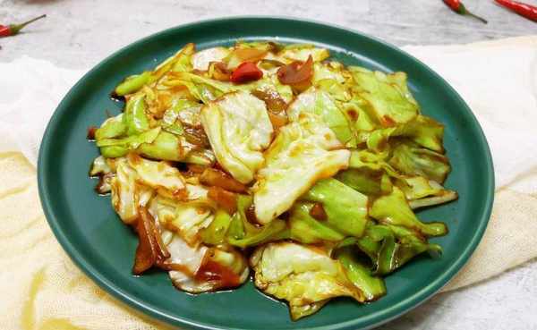 2、锅里放入一勺猪油,烧热后放入蒜末、红辣椒爆香,倒入包菜叶大火翻炒2分钟,包菜变软后倒入料汁翻炒1分钟,即可出锅。
