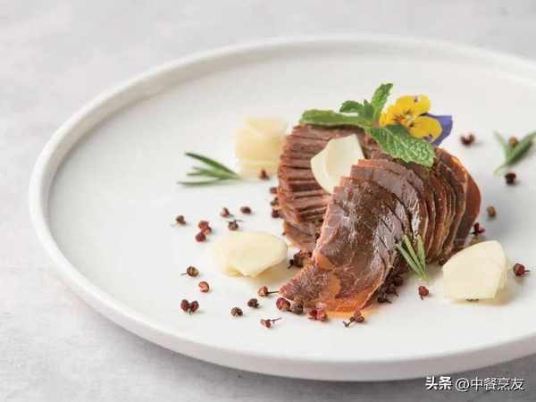 3.把烤好的牛腱肉片再放入蒸箱蒸1.5小时,取出晾凉,切成均匀薄片,摆盘后放上蒜片、花椒,稍点缀即成。